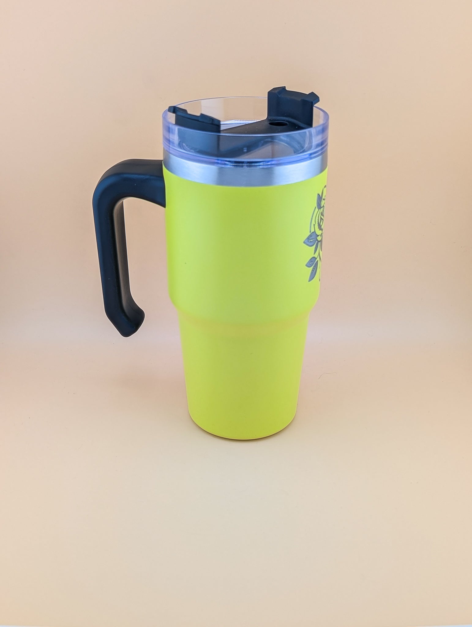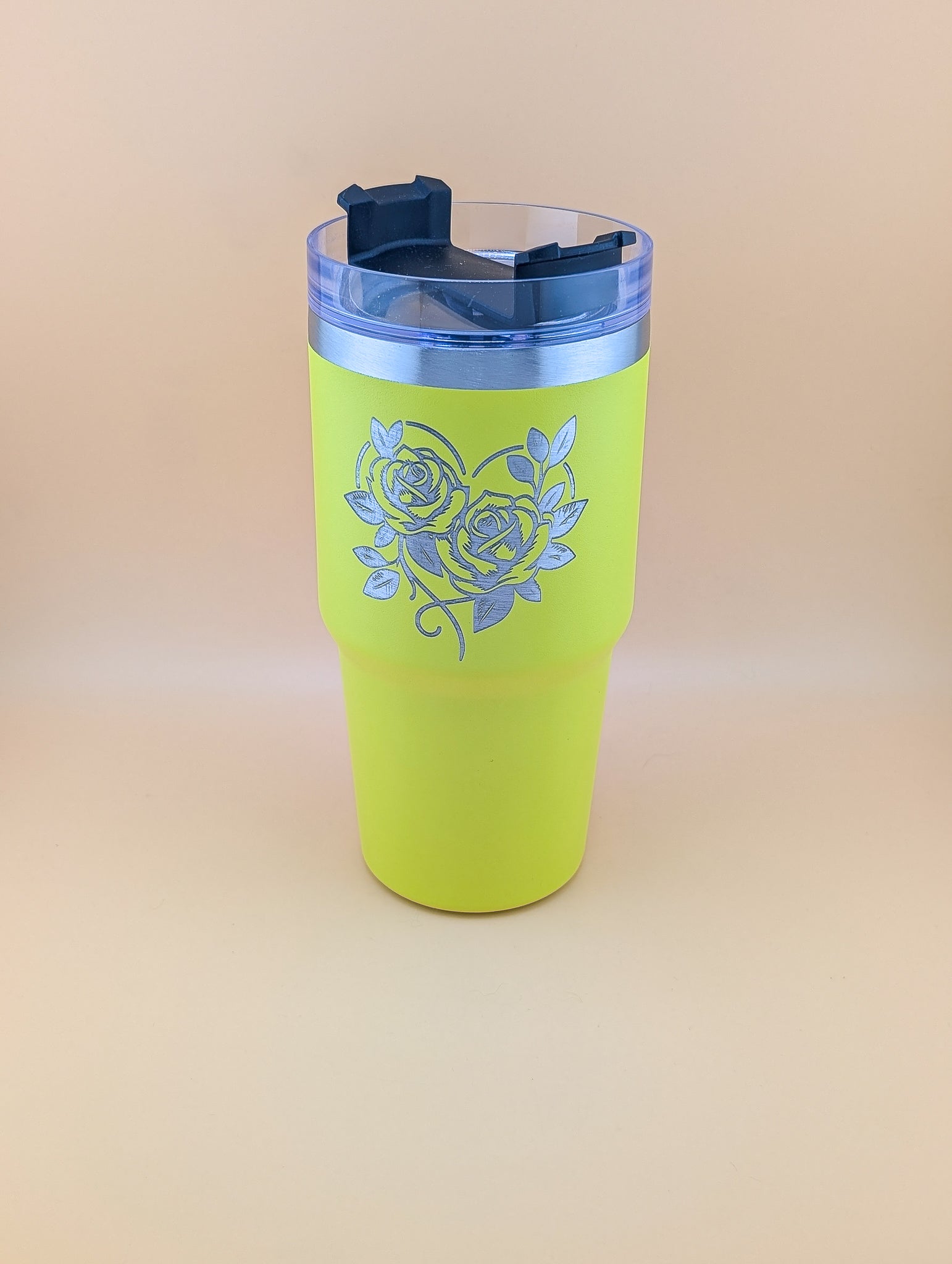 And to make it even more special, this particular tumbler has been laser engraved with a beautiful rose design. But if you have your own design or would like to add a name, simply email us and we will be happy to discuss further.